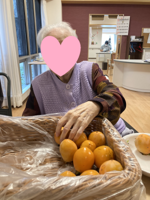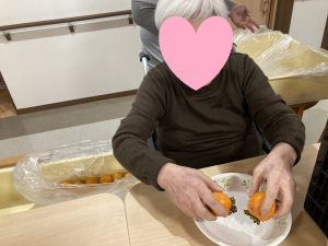 入居者の皆様に、お皿にいれた焼酎に柿のヘタをつけて容器にセットしたビニール袋の中に逆さに詰めていっていただく作業を手伝っていただきました☆干す方法は一般的ですが、焼酎で渋を抜く方法は皆様始めてだそうで「こんなんで渋がぬけるの?!」「うちの渋柿、今まで捨ててたわ~もったいないことした~!」と驚きながらも楽しそうに作業を手伝ってくださいました♪