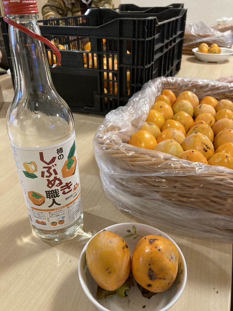 先月甘柿の収穫作業を行った際に、入居者様とケアガーデンの渋柿がもったいないという話になったのですが、干し柿はこの地域だとカビが生えてしまったりとなかなか難しい・・・という事で今回は渋抜き用焼酎を使って渋抜き作業を行いました~☆