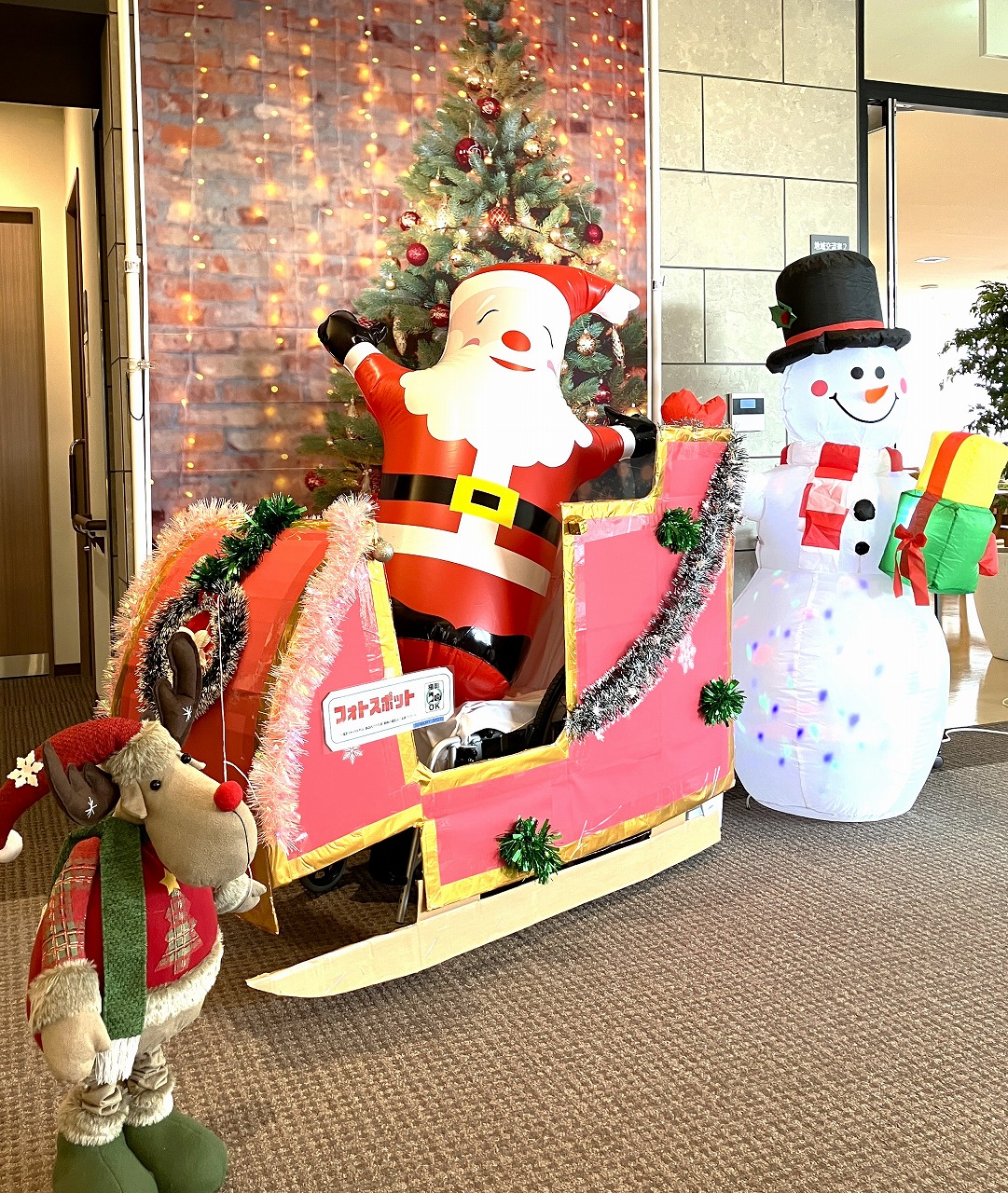 エントランスにサンタさんがそりに乗って登場しました!