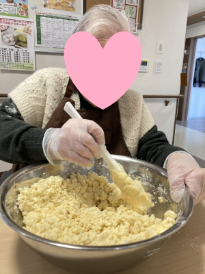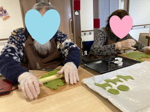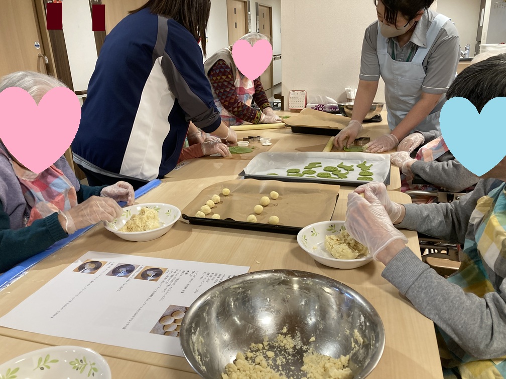 クッキーを2種類作りたい!という欲張りな企画なので、それそれどちらのクッキーを作りたいかお伺いして二手に分かれての作業です♪バターをクリーム状に練る作業はなかなか力のいる作業でしたが「ちょっと疲れちゃったから、あなた変わって~」と声を掛け合いながら皆様交代して作業を進めていきます。バターがクリーム状になったらお砂糖や薄力粉などを加えて混ぜていくとクッキー生地の完成です♪スノーボール担当は手でお団子を丸めるように小さく丸めていき、型抜き担当は今年の干支!馬の型やダルマ・謹賀新年などの型を使って慎重に型を抜いていきます(^^♪ 時々上手く型抜きできなかったりする場面もありましたが「また丸めちゃえば大丈夫よ!」とお互いに応援しながら、皆様楽しそうに作業して下さいました♪用意ができた生地はユニットのオーブンで焼いていきますが、どこからともなくプ~ンと甘い匂いが漂ってきます。