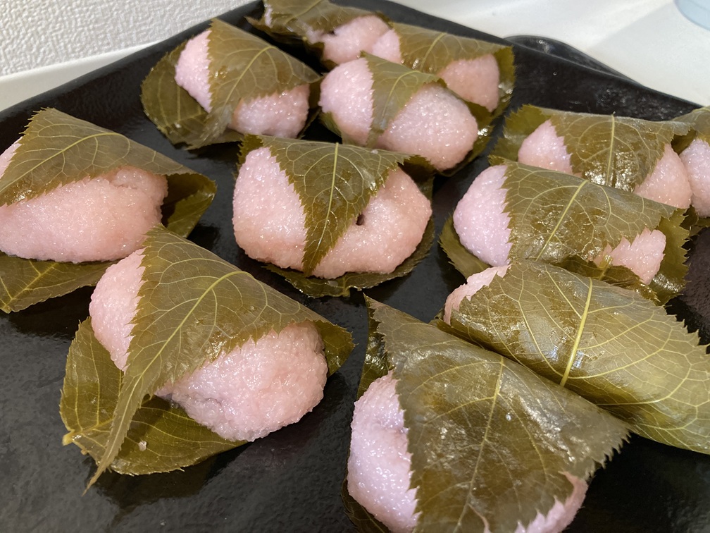 作り方はとっても簡単で、道明寺粉に砂糖やピンク色に着色したお水を混ぜて電子レンジでチンして蒸した生地で餡を包んで、桜葉の塩漬けを付ければ完成です!